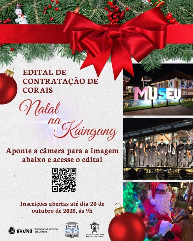 A Prefeitura de Bauru, através da Secretaria de Cultura, informa que as inscrições para o edital de contratação de corais se encerram hoje, 20 de novembro, às 9h. Este edital é uma oportunidade para grupos de música popular natalina se apresentarem durante o 2º Natal na Praça Kaingang, que está agendado para dezembro, no Museu Ferroviário Regional de Bauru. Os interessados devem realizar a inscrição de forma online, e todos os detalhes, incluindo o edital e o formulário, estão disponíveis no site oficial da Prefeitura.
